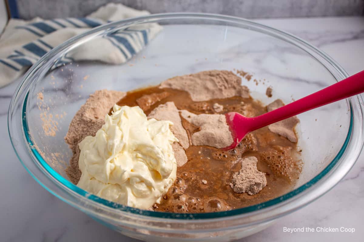 - Mix flour, sugar, cocoa powder, baking powder, baking soda and salt into a mixing bowl.1 cup sugar, 2 cups flour, 3 Tablespoons unsweetened cocoa powder, 2 teaspoons baking powder, 1 teaspoon baking soda, ¼ teaspoon salt